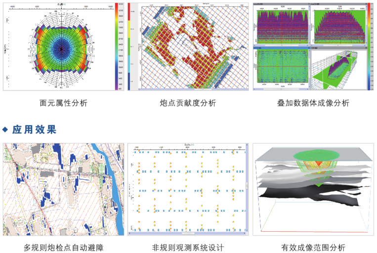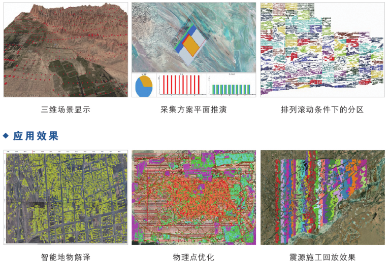 融合GIS系统扩展GIS算法工具箱、三维场景显示、打印布局工业制图、复杂区影像地物智能解译、分块的路径自动计算、施工方案的经济评估、采集方案平面推演、震源施工效果回放