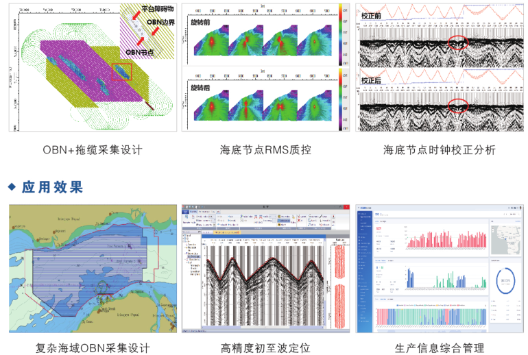复杂海域观测方案设计、工作量统计及效率测算、海量连续道集数据高速切分、OBN节点时钟校正及角度分析、OBN高精度初至波定位、气枪激发状态质控、拖缆采集实时质控、生产信息综合管理