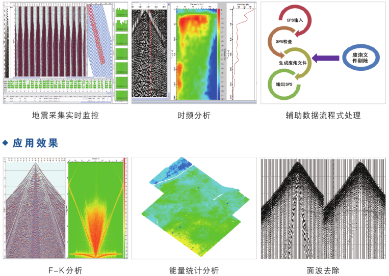 2万炮/日质控能力、20TB/日转储效率、流程式辅助数据处理、可控震源实时质控、多种数据格式转换、全面数据分析功能