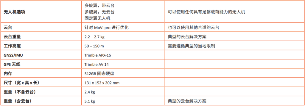 大的小型计算机和一个高端 GNSS/IMU 组件。该款先进解决方案重量仅为 2.1 kg,可搭载于多种类型(如多旋翼或固定翼)的无人机平台,也可以无需云台单独使用。可以按照飞行计划中的航点自动获取数据,操作非常 简单。